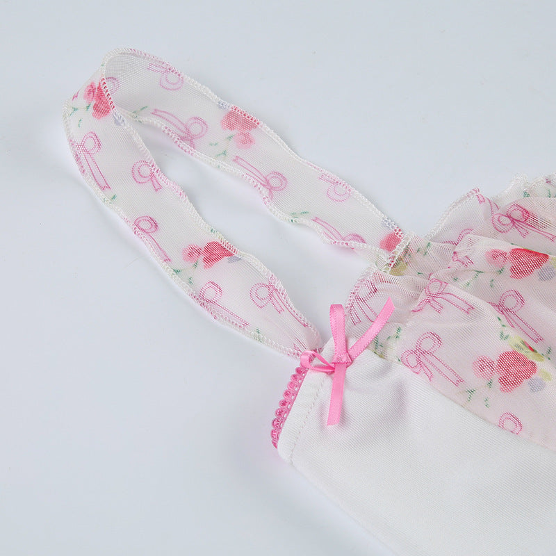 soft, semi-sheer mesh romantic cami featuring delicate pink bows and rosebuds, structured cups with light ruching and ruffled trim, and princess seams that enhance the fitted silhouette ★